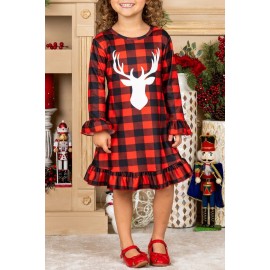 Girls Reindeer Allover Plaid Ruffled Christmas Dress