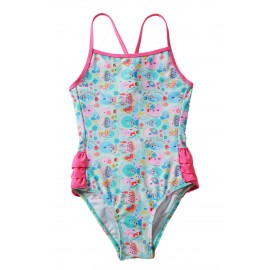 Simple one piece swimsuit with adjustable strapsBlue ruffles encircle the waist for an adorable tutu